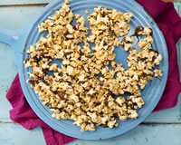 5- Melt the chocolate chips using a double boiler. Drizzle the chocolate over the cooling popcorn. Transfer to the fridge to finish cooling, at least 30 minutes. Once completely cool, store in an airtight container at room temperature for up to 7 days.