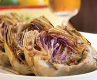To prepare the artichokes, fill a medium bowl 2/3 full with cold water. Stir in the vinegar. Working with the artichokes one at a time, remove the outer leaves until you reach the inner yellowish leaves. Trim 1/2 inch off the top and cut off almost the entire stem, leaving just enough stem so the artichoke stays intact. Cut the artichoke in half lengthwise and scoop out the hairy core. Put each artichoke in the vinegar water immediately after preparing it to prevent browning.