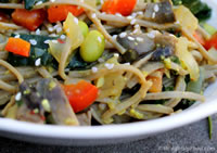 This hearty Asian noodle dish is made without soy sauce, salt, or oil, but it's still full of flavor, with garlic, cilantro, ginger, curry, and lime juice -- and for those that like it a little spicy, some optional red pepper flakes.