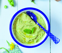 Steam the peas for just one minute, then immediately place them under cold running water to stop the cooking. If desired, reserve some of the cooled peas for mixing in just before serving (this makes for a coarser texture with some crunch). Add the rest of the peas and the tahini, lemon juice and zest, garlic, cumin, and mint to a food processor or blender and blend until smooth and creamy. If you make the purée with frozen peas, you may wish to add a handful of fresh peas at the end. Add salt and pepper to taste. Makes 2 servings.