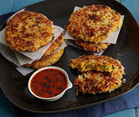 Drizzle Korean spicy sauce on pretty much anything, and you’ll wind up with a hit. Combined with these crispy-on-the-outside, smooth-in-the-middle fritters, you’re likely to have anyone who tastes them clamoring for more. Our advice? Make a double batch. (Note: the gochujang sauce ingredient is available at most natural food stores if you don't have a Korean market in your area.)